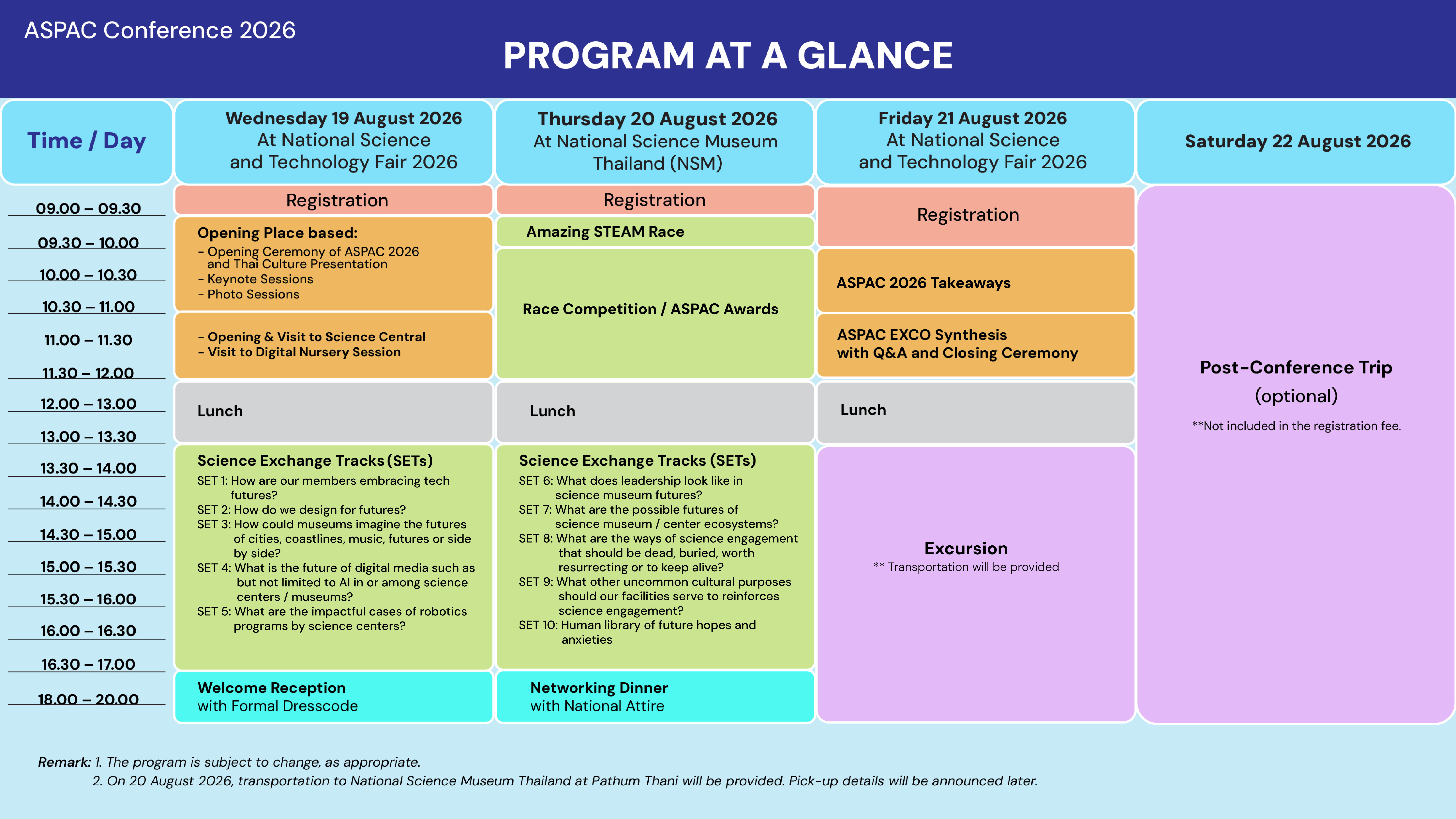 The ASPAC Conference is the annual gathering of the Asia Pacific Network of Science and Technology Centres. It offers a broader professional platform for practitioners, educators, curators, researchers, and institutional leaders to exchange knowledge, share best practices, and explore emerging trends in science communication and public engagement. The conference program features keynote sessions, thematic tracks, parallel discussions, exhibitions, and networking opportunities that foster collaboration across institutions and regions.